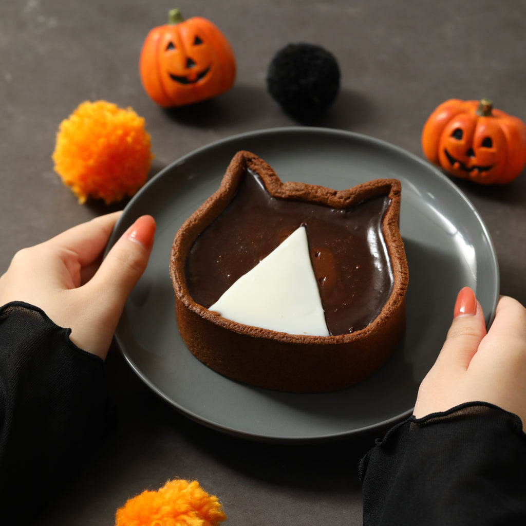 今年も「ねこねこ」から『はちわれ~チョコチーズタルト~』が期間限定で登場!8の字のように毛色が分かれた「はちわれ」のねこをイメージした季節限定のチーズタルトです🖤ココア風味のタルト生地にクリームチーズとガーナ産のカカオマスを使用した生地を流し込み、ホワイトのグラサージュでねこの「はちわれ」模様を表現いたしました。ほんのりビターなココアの風味と、口あたりなめらかでコクのある味わいをお楽しみいただける、ハロウィンパーティのメインにもぴったりなスイーツです🎃