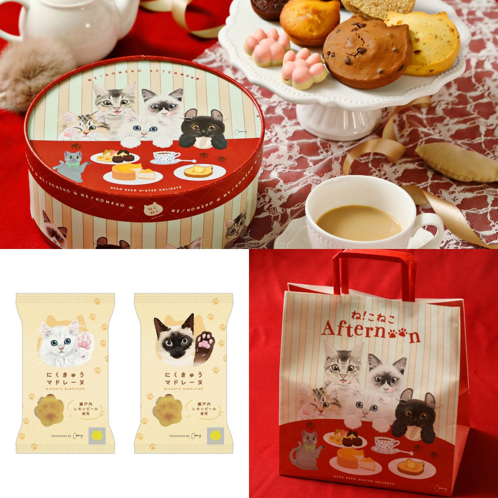 テーマ「~ね!こねこAfternoon~」の新デザインBOXに、7種類のスイーツを詰め合わせた『ねこねこウィンターアソートBOX』と、爽やかなレモンが香る、ねこのにくきゅうをモチーフにした人気商品『にくきゅうマドレーヌ』をお届けします。