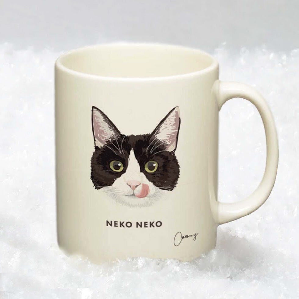 舌をぺろっと出した可愛らしい表情の"はちわれ"のねこちゃんがデザインされた、マグカップです。可愛らしいマグカップを使えば、気分も上がること間違いにゃし🖤