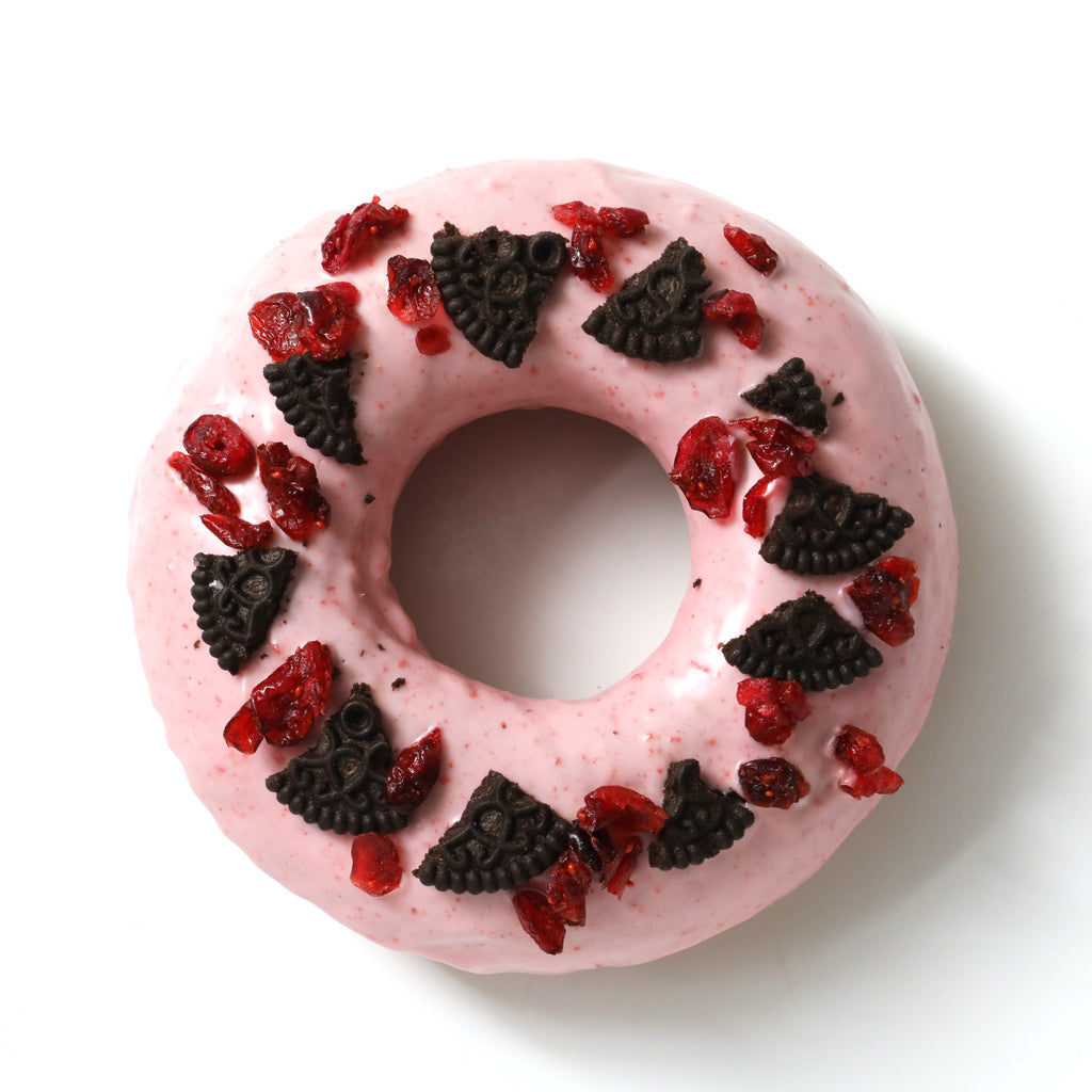 ドライクランベリーとホワイトチョコを巻き込んだいちご味のデニッシュに、いちごコーチングをして、ココアビスケットとドライクランベリーをトッピングしました。