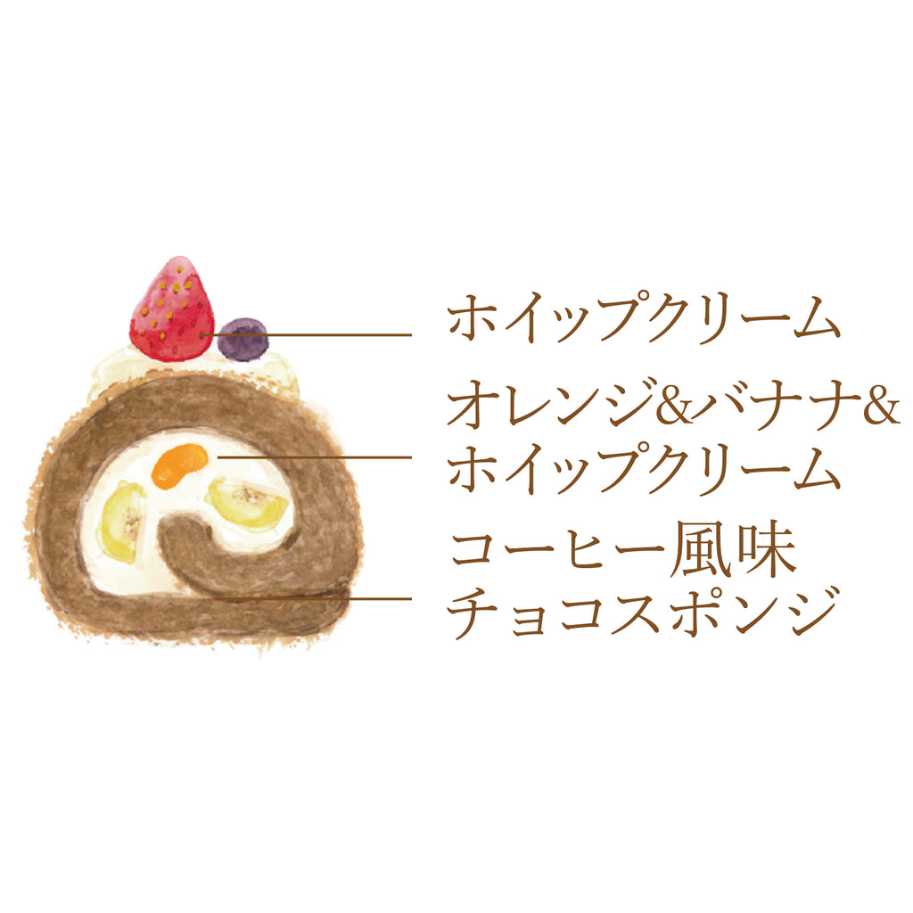 表面はさっくり、中はふんわりしたコーヒー風味のチョコレート生地で、オレンジとバナナを巻いたロールケーキです。