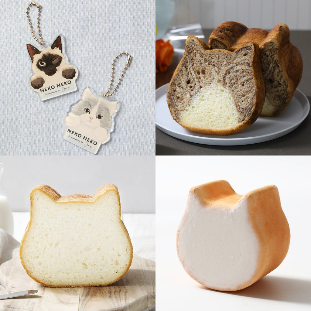 オンラインストア限定の『ねこねこ食パン キジトラ』、『ねこねこ食パン プレーン』、福島県の伝統工芸品「はりこ」で作った『はりこねこねこ食パン』をお届けします。