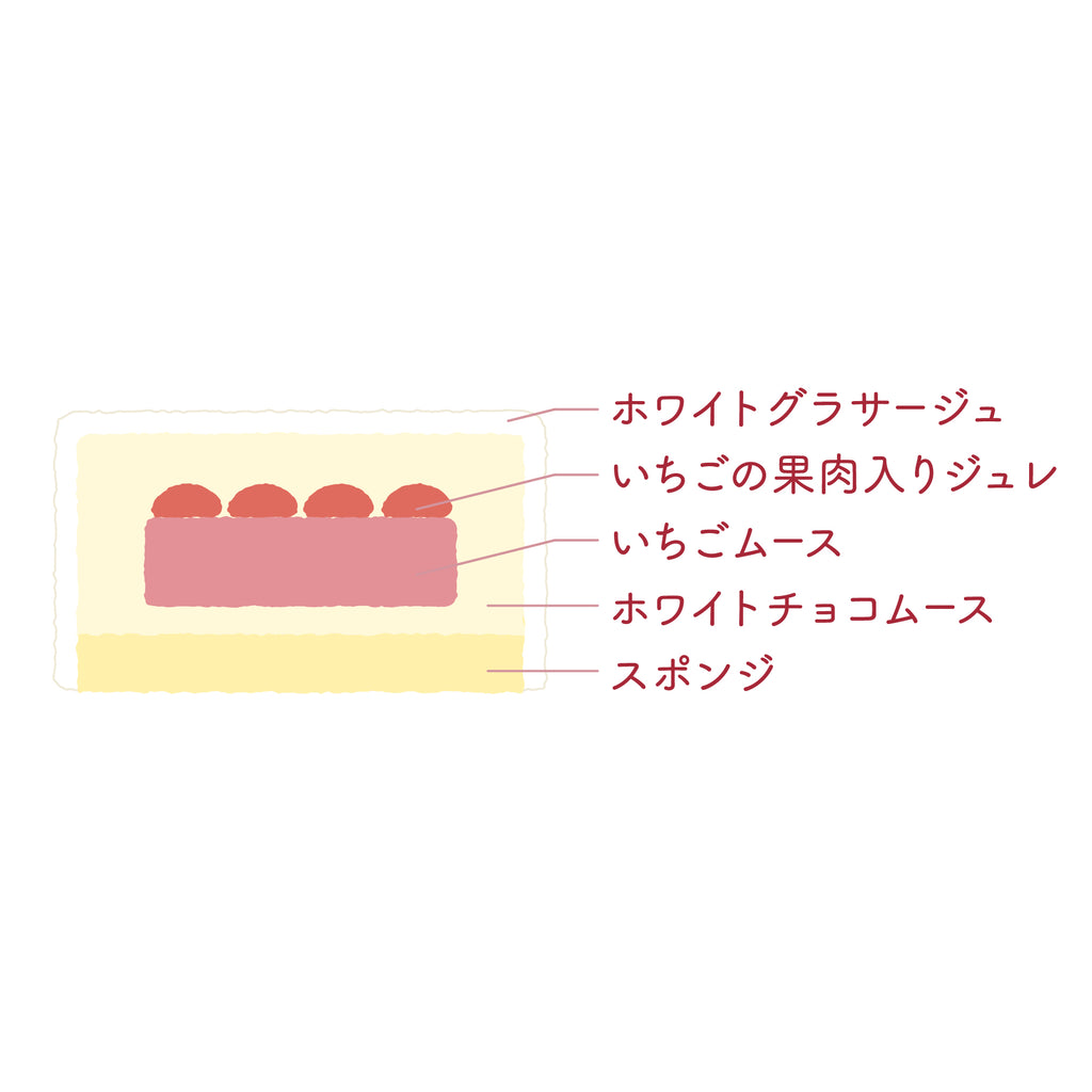 ホワイトチョコムースで、いちごムースと果肉感を楽しめる甘酸っぱいいちごソースを閉じ込めました。仕上げにホワイトョコのグラサージュで艶やかなビジュアルに。口いっぱいに広がる甘いホワイトチョコの味わいと、甘酸っぱいいちごで最後まで飽きることなくお楽しみいただけます。
